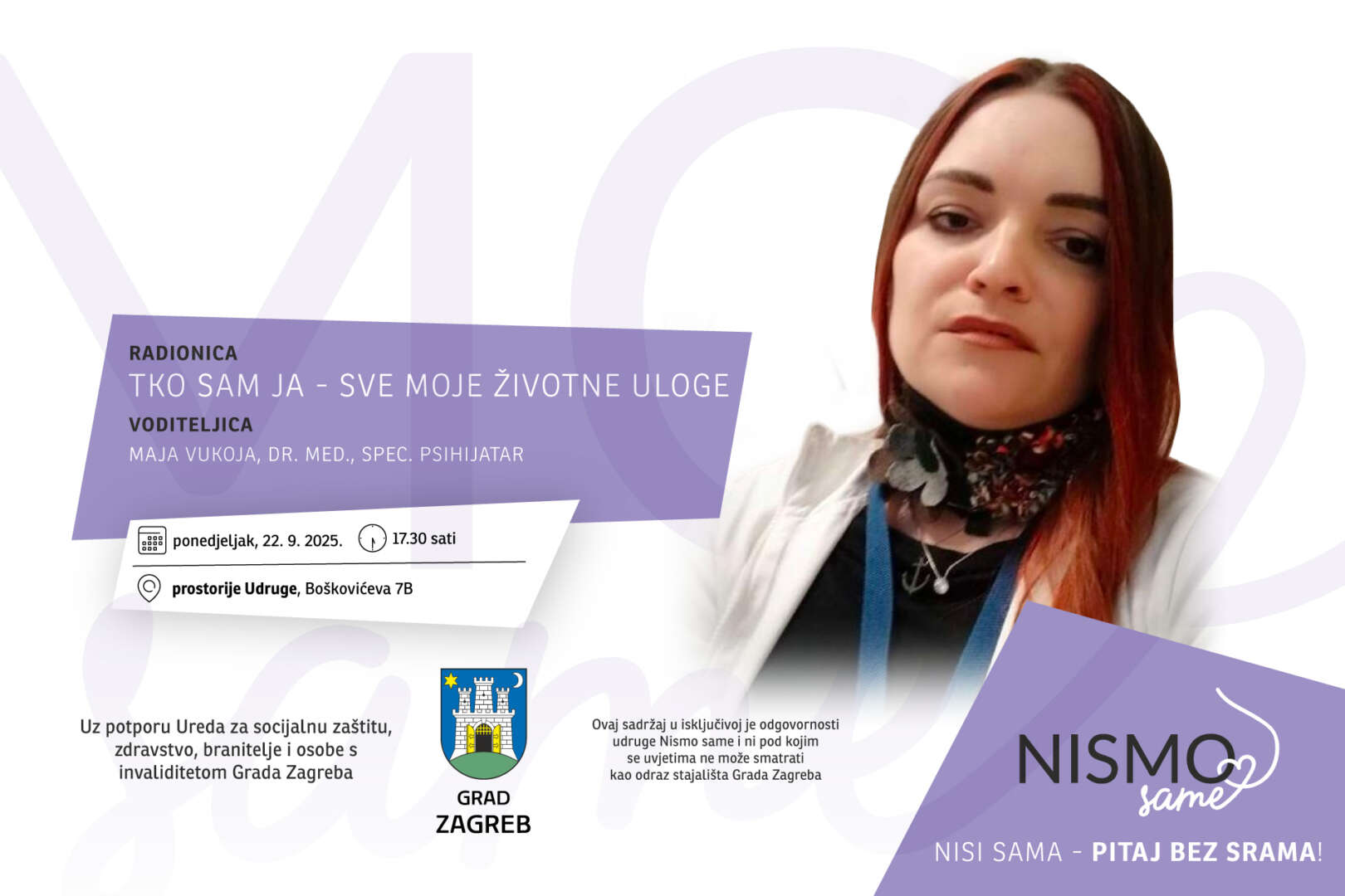 Suradnica udruge Nismo same, psihijatrica Maja Vukoja, održat će u ponedjeljak, 22. rujna 2025., u Nismo same radionicu pod nazivom “Tko sam ja – sve moje životne uloge“.